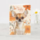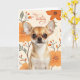 A sweet birthday card for the Chihuhua dog lover featuring a cute tan and white Chi with short hair against a bold, retro floral pattern in shades of orange and cream hues.