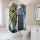 SHOWER CURTAIN FEATURES A RUSTIC WOODEN DOOR WITH AN ARCHED WINDOW ABOVE AND ROSES, YELLOW ON ONE SIDE AND PINK ON THE OTHER (TAKEN IN ITALY). PHOTO DIGITALLY MANIPULATED FOR SPECIAL EFFECTS SOMEWHAT SIMILAR TO A TROMPE L'OEIL PAINTING.