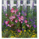 THIS SHOWER CURTAIN FEATURES TALL PURPLE FLOWERS, PINK BEGONIAS, DAINTY YELLOW FLOWERS BACKED BY A WHITE PICKET FENCE AND LOTS OF GREEN FOLIAGE. PHOTOGRAPHY WITH DIGITAL EFFECTS FOR PAINTERLY LOOK.