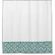 This shower curtain has mainly white with a green medallion border. The tiles have two shades of cool green with a teal green accent.