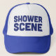 SHOWER SCENE fun and ironic slogan on trucker hat, blue, funny typographic statement, inspired by tv comedy character frank rossitano
