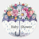 This delicate watercolor illustration features a dark blue umbrella adorned with vibrant pink, red, and yellow flowers, catching gentle blue raindrops – a beautiful symbol of the joy and blessings showered upon the parents-to-be at their baby shower.
