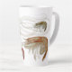 Tall latte mug in white with four shrimp design. Illustrated, but lifelike, shrimp with long, swirling antennae cover the cup in earthy colours and have light shadows so the image pops off the mug a bit. Also comes in a shorter mug.