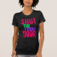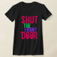 Shut The Front Door! So much better then throwing a curse word in there and it's funny. With vivid pink, green, and purple lettering on a black basic dark t-shirt.