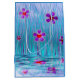 A digital drawing of cute stylised purple flowers with shining red centres. They're peering quizzically at you from the tall grass beside a pool of clear rippling water.