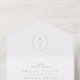 The simple gold typography design features a geometric oval monogram with the initials of the couple and an modern minimalist feel.