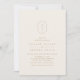 The simple ivory and gold typography design features a geometric oval monogram with the initials of the couple and a modern minimalist feel.