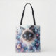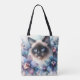 This tote bag features feline watercolor artwork of a blue-eyed Siamese cat surrounded by orchids in cool colors such as pastel blue and purple.