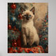 Vintage-style Christmas poster featuring an adorable Siamese kitten with a festive backdrop, complete with a classic Christmas tree. Perfect for adding holiday charm and warmth to any space.