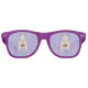 This awesome pair of party shades features a graphic image of a cute Siamese fancy rat with a cream coloured body, pink feet and paws, brown ears, nose and tail and little red eyes. The sweet little rat is holding a tasty Birthday cake in its paws. The cake is a chocolate cake topped with pale yellow frosting and filled with red jam. There are nine candles alight on top of the cake.
