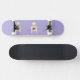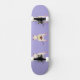This awesome skateboard features a graphic image of a cute Siamese fancy rat with a cream coloured body, pink feet and paws, brown ears, nose and tail and little red eyes. The sweet little rat is holding a tasty Birthday cake in its paws. The cake is a chocolate cake topped with pale yellow frosting and filled with red jam. There are nine candles alight on top of the cake.