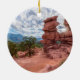 Colorado Ornament souvenir featuring a sunburst of the sun shines at the Siamese Twins in Garden of The Gods with a view of the Rocky Mountains and Pikes Peak in the background. Garden Of The Gods is a National Natural Landmark in Colorado Springs, Colorado.