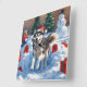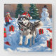 A spirited Siberian Husky runs joyfully through the snowy winter scene, wearing a festive red Christmas hat. This lively design highlights the breed’s thick double coat, striking eyes, and adventurous spirit while capturing the warmth and joy of the holiday season. A heartwarming winter moment full of festive cheer.