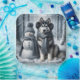 A fluffy Siberian Husky wearing a scarf and earmuffs sits beside a cheerful snowman adorned with a hat and scarf