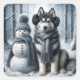 A fluffy Siberian Husky wearing a scarf and earmuffs sits beside a cheerful snowman adorned with a hat and scarf