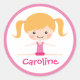 Cute and fun name / property stickers featuring a little cartoon girl with blonde hair doing a side split. Around is a pink border. Customisable text, add a name or other text. Cute design for labelling childrens school books or other belongings.