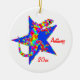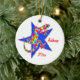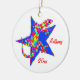 Whimsical Sidney Salamander looks like he enjoys swinging on this bright blue star. Fun colourful fanciful rendition design on keepsake Christmas ornament for kids and adults. All text may be personalised in template provided. Original art and design by Anura Design Studio.