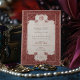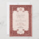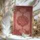 This exquisite wedding invitation captures the essence of traditional Muslim matrimony with its elegant lace design in a warm, ruby hue. The delicate intricacies of the border frame the page, leading the eye to the sacred Islamic calligraphy at the centre top. The aged parchment-like background provides a vintage feel, while the ornate details around the edges resonate with the grandeur of classic Muslim art. The rich colour palette of burnt orange, with accents of dark terracotta and subtle cream, evokes the feeling of a sunset, perfect for an evening of celebration. This invitation is not only a herald of the upcoming nuptials but also a keepsake of cultural beauty and significance.