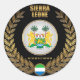 The national coat of arms of Sierra Leone, is set on a black background. The emblem is infused into a faux gold rimmed circle shape, and that, in turn, is nestled in the middle of a faux gold laurel wreath. At the base of the wreath, is the national flag infused into a circle which is part of the wreath. The design is completed by the country name, which is also in faux gold.