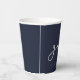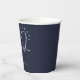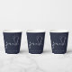 Signature script "grad", graduation party paper cups. White typography on navy blue background.