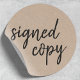 A simple "signed copy" custom design in modern minimalist handwritten script typography in an informal casual style in black on a rustic kraft background. The perfect book signing accessory for any author or writer! #signedcopy #sticker #author #rustic