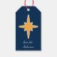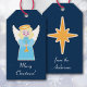 This personalised Christmas gift tag features a blonde angel with a gold halo and blowing a gold trumpet. She is dressed in light blue with white wings. Your custom text is in white at the bottom, and both the text and angel are placed on a dark blue background. The back of the tag has an image of a gold Christmas star with a 2nd custom text field. This gift tag matches the Silent Night Christmas Nativity wrapping paper in our store. *Clip art used in this design is copyrighted by Encore Software, Inc., which permits use to its licensors. All rights reserved.
