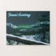 Features a night scene in the far north. Night has fallen and there is a hint of the Northern Lights beyond the mountains on the horizon. Moonlight reflects off the snow-covered landscape. An owl sits in a dead spruce tree seeking voles. Text reading "Season's Greetings" appears in glowing blue and white.