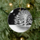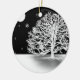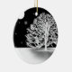 A simple black and white design. White snow, white tree, white snowflakes and a white moon against a pitch black sky.