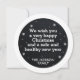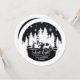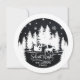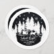 Christmas round sticker featuring white pines silhouettes with snowflakes and a horse-drawn sleigh on a black background, with the wording Silent night in handwritten lettering. Easily customisable by adding your own family name or text