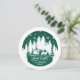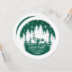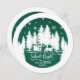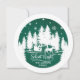 Christmas round sticker featuring white pines silhouettes with snowflakes and a horse-drawn sleigh on a green background, with the wording Silent night in handwritten lettering. Easily customisable by adding your own family name or text