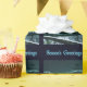 Features a night scene in the far north. Night has fallen and there is a hint of the Northern Lights beyond the mountains on the horizon. Moonlight reflects off the snow-covered landscape. An owl sits in a dead spruce tree seeking voles. Text reading "Season's Greetings" appears in glowing blue and white.