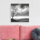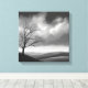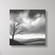 This striking black and white landscape painting features a lone tree standing tall in a vast valley beneath a cloudy sky. The timeless scene evokes feelings of solitude, serenity, and the enduring power of nature.