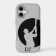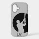 This phone case for the baseball player or fan features a cutout silhouette of a baseball player at bat and ready to swing. The figure is surrounded by a dramatic black circle that is placed off center to give the image more interest. Shown with a light silver gray background, but you can pick your own background color to represent your favorite team! Just click on "Customize It" and use the color picker to change it. Your monogram is in black at the bottom. *Clip art used in this design is copyrighted by Encore Software, Inc., which permits use to its licensors. All rights reserved.