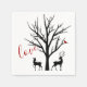This winter paper party napkin design features a silhouette doe and buck deer couple. The are standing under a leafless tree with a red bird all done in black, white and red. ^