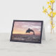Silhouette dolphin leaping from the ocean in front of a sunset and land with a purple border. Great birthday card for the animal lover. 2014 © Design by Julia Bryant.