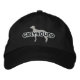 This cool Greyhound hat is embroidered with the dog breed's silhouette, standing with its name printed in front. The Greyhound silhouette is a silver grey, and the text outline is white. The design looks amazing on our black hats!