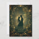 Silhouette of a couple in love, a wedding card illustration with a golden floral frame on a dark green background, a romantic and dreamy atmosphere..