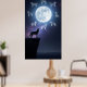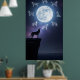 Silhouette of a husky howling on a cliff under a huge full moon revealing the constellations