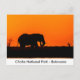 Postcard with and image of the silhouette of an elephant bull grazing on Sidudu island in Chobe River, Botswana, as the sun sets.