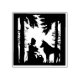 This wood art stamp for your craft projects has a silhouette image of little red riding hood sitting under trees with a watering can in the forest talking to the wolf.