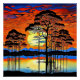 A.I. assisted print of the sky ablaze with vibrant hues as a landscape of silhouetted of tall trees are reflected on the surface of a serene lake at sunset.