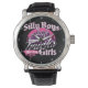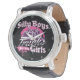 This empowering wall clock makes a playful yet powerful statement about women in trucking. Against a black background with a pink rim, it features a purple semi-truck and the bold text: "Silly Boys Trucks Are For Girls". It's an ideal gift for any female truck driver who takes pride in breaking stereotypes. The design tool can also be used to add custom text if you want your name or company on this clock. You can customise the colour of the frame to any colour you desire by going into the design tool.