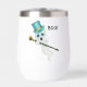 This drink tumbler has a silly ghost with blue eyes with a blue top hat on his head holding a black cane with gold trim topped with a gold skull on the front and back. Customise the Boo text with the template.