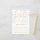 Capture heartfelt memories with this Silly Goose Is Soon to Be on the Loose Baby Predictions and Advice card. Featuring the coordinating blue gingham background and sweet goose with coquette bow, this baby shower keepsake card invites guests to share advice, predictions, and well wishes. Pair with the matching guest book, invitations, and thank you cards from the Silly Goose baby shower collection for a cohesive and meaningful baby boy shower experience.