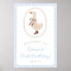 Welcome guests to your celebration with this playful and charming birthday welcome sign. Featuring a whimsical goose dressed in boots against a soft blue gingham backdrop, this design adds a touch of fun and elegance to any birthday party.