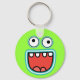 Here's a face cute monster style! Big wide open cartoon mouth with four gapped teeth and little pink tongue, and two big googly eyes. Never lose your keys again! Bright lime green background with electric blue coloured face details. Grin portion of this design is by JWI Designs.