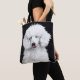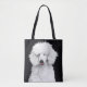 An adorable white poodle sure to make anyone smile on this wonderful tote bag.
