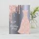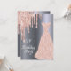 Elegant, classic, glamourous and girly style party invitation. A rose gold dress with faux rose gold glitter drip, paint drip look. Faux silver metallic looking background. With the text: 50th Birthday Party on front written with a modern light grey coloured hand lettered style script.