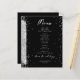 Winter Silver and Black Glitter Wedding Menu. Script font highlights with easy to read serif name font. Easy to adjust for your own wedding needs. Make your own menu, use your own text to create an elegant yet cheap and affordable event menu. Easy to personalise. Custom menu paper sheets.