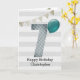 A silver and blue happy 7th birthday card for boys, which you can personalize the front with his name. The front of this striped 7th birthday card for him features the number seven in a blue striped design with a blue balloon ready to float away. The background is a soft white and gray with a soft silver bunting banner at the top. The inside message can be easily personalized if you wanted. A great 7th birthday keepsake for kids.